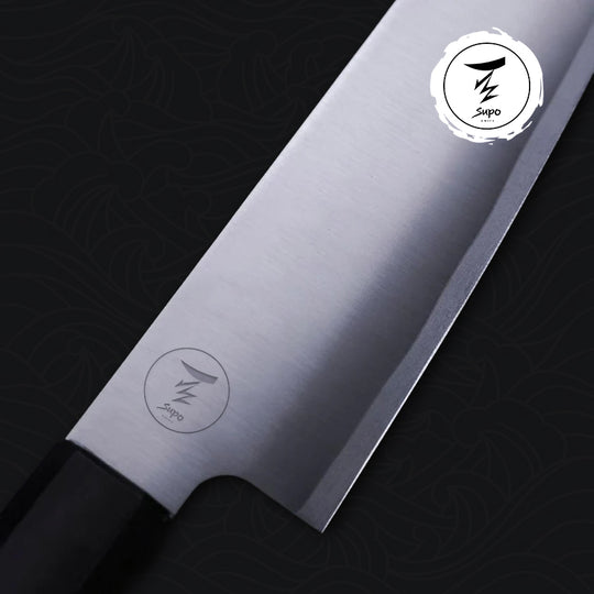 The Santoku is a multi-purpose Japanese knife, translating to "three virtues" (meat, fish, vegetables). It features a shorter, flatter blade for efficient straight up-and-down chopping and mincing.