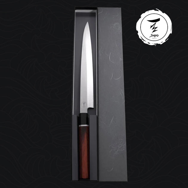 The Sujihiki is a long, narrow Japanese slicer designed for making single, clean strokes through boneless meat, poultry, and fish (like roasts and sashimi) with minimal friction.